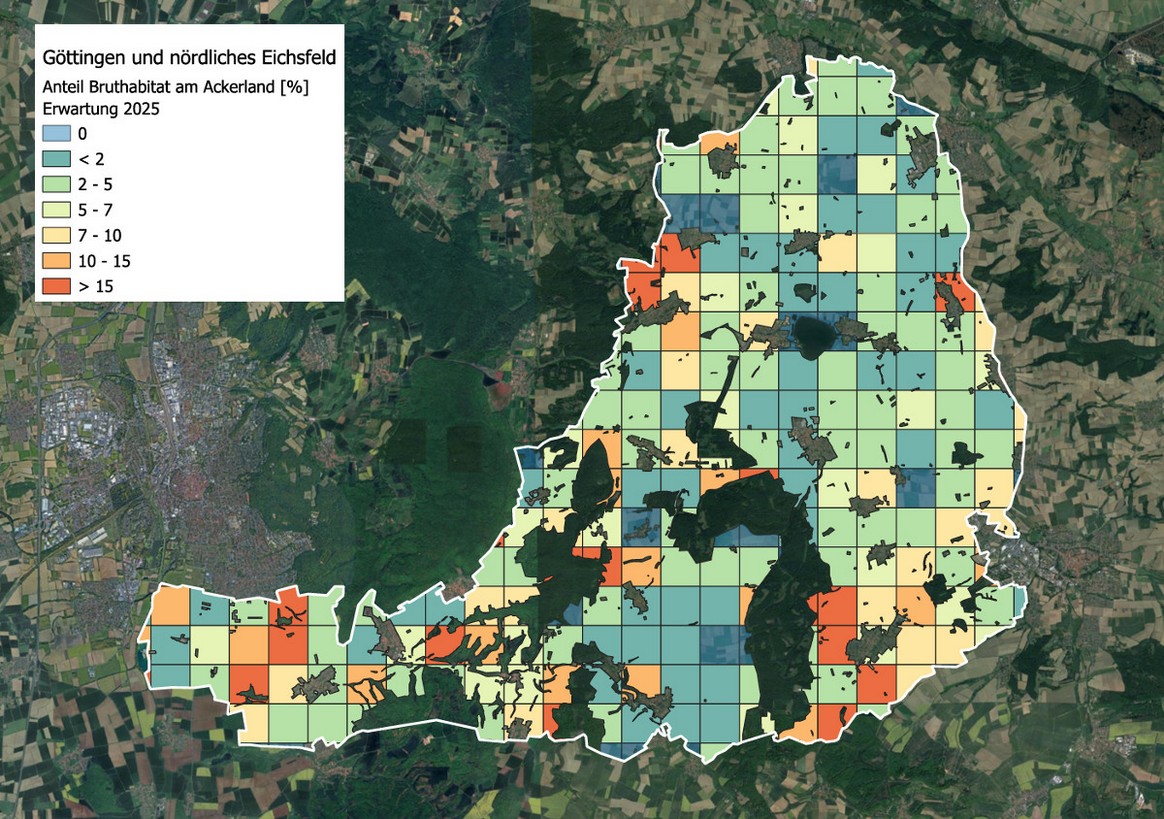 Das Projektgebiet „Göttingen und nördliches Eichsfeld“ wird durch das Teilprojekt der Universität Göttingen (Abt. Naturschutzbiologie) betreut. Das fast 200 km² große Projektgebiet deckt die Zähl-Kulisse des seit 2006 laufenden Rebhuhn-Monitorings komplett ab.
