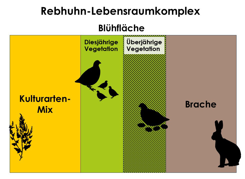 Andere Maßnahmen, wie z.B. die experimentelle Maßnahme „Rebhuhn-Lebensraumkomplex“ werden komplett aus Projektmitteln finanziert. Der „Rebhuhn-Lebensraumkomplex“ (angelehnt an eine Maßnahme aus Hessen), setzt sich aus einer strukturreichen Blühfläche im Zentrum, sowie zwei anliegenden Streifen, die mit einem Kulturarten-Mix (wie z.B. Amaranth, Lein, Sonnenblume, Kolbenhirse, Rispenhirse, Quinoa, Markstammkohl) angesät werden, zusammen. In den Folgejahren wird jeweils im Frühjahr eine Seite des Kulturarten-Mix neu eingesät, die andere Seite bleibt als vorjährige Brache stehen. So entsteht eine vierteilige Maßnahmenfläche mit vielfältiger Vegetationsstruktur, welche Rebhühnern und vielen weiteren Vogelarten ein sicheren Brutlebensraum bereitstellt. Zusätzlich bietet die Maßnahme im Winter Deckung und ein reichhaltiges Angebot an Winternahrung für samenfressende Vogelarten.